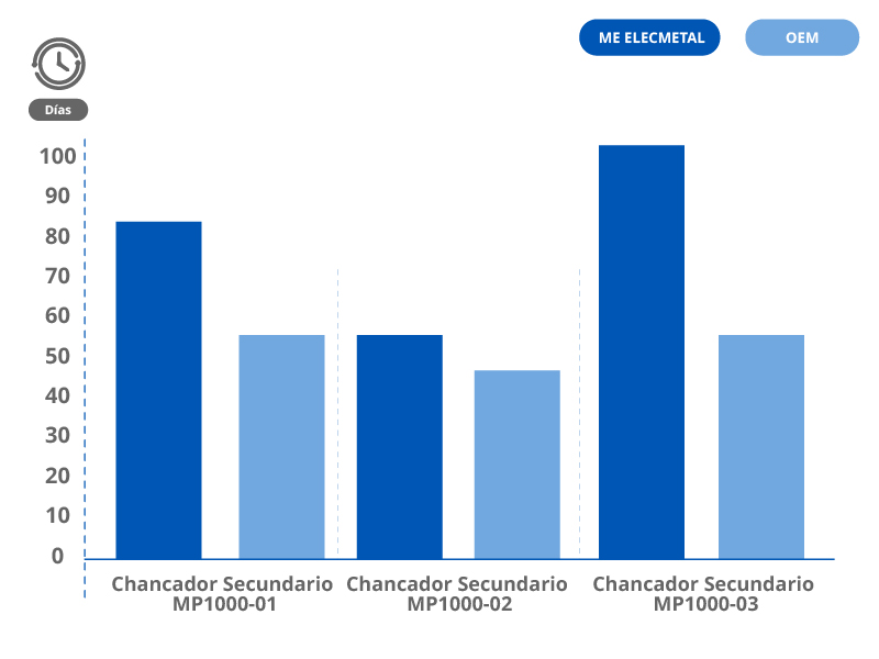 En el siguiente gráfico es posible comparar el total de días efectivo en campaña. Se evidencia que en todos los casos los revestimientos ME Elecmetal superan la duración máxima del OEM.