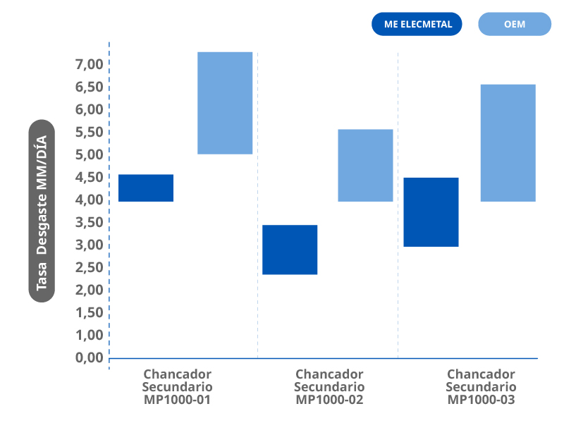 El siguiente gráfico muestra la tasa de variación mínima y máxima de desgaste en milímetros por día. Los resultados dan cuenta de que los revestimientos ME Elecmetal tienen un avance promedio menor que el OEM.