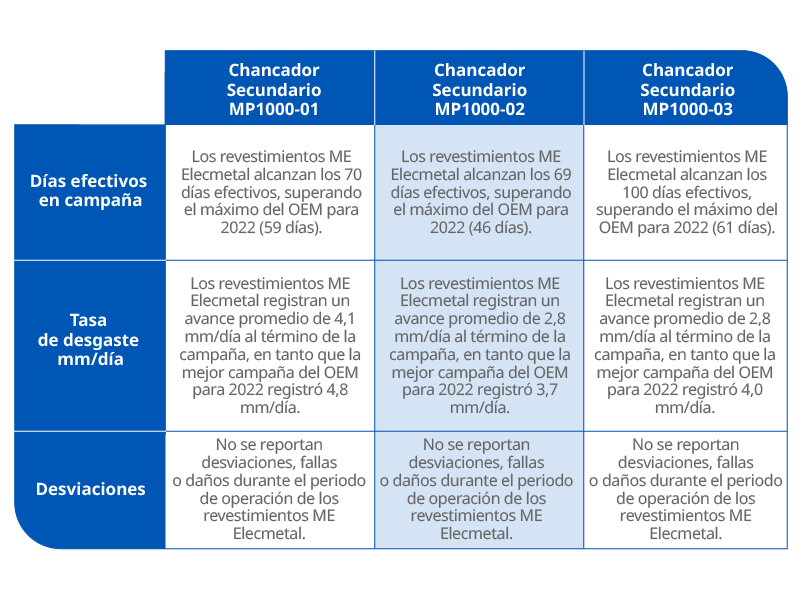 Pruebas realizadas muestran un aumento considerable en el procesamiento: 46% más en los Chancadores Secundarios MP1000-01, 50% más en el MP1000-02 y 64% más en el MP1000-03. Estas cifras comparan la mejor campaña del OEM vs el desempeño de los revestimientos ME Elecmetal.