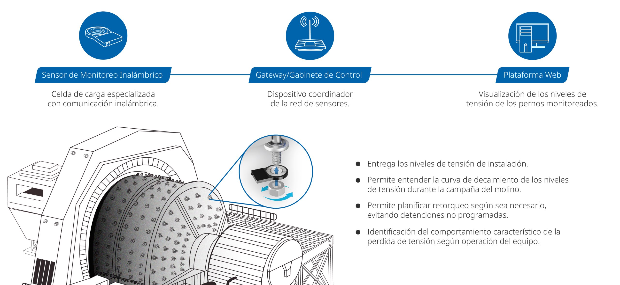 Para su seguimiento y monitoreo de tensión de pernos se considera el monitoreo de tensión de pernos con la instalación de 73 sensores 38 en el molino SAG 1 y 35 en molino SAG 2.
