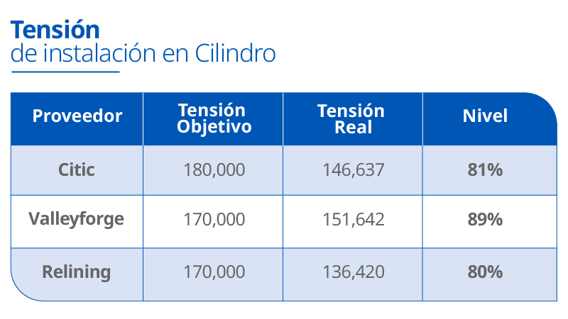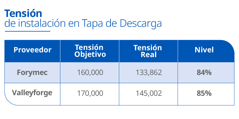En comparación con otros proveedores, se registran mayores niveles de tensión de instalación con llaves calibradas a 170,000 lbf. En el cilindro se alcanza el 89% de la tensión objetivo y en la tapa de descarga el 85%.