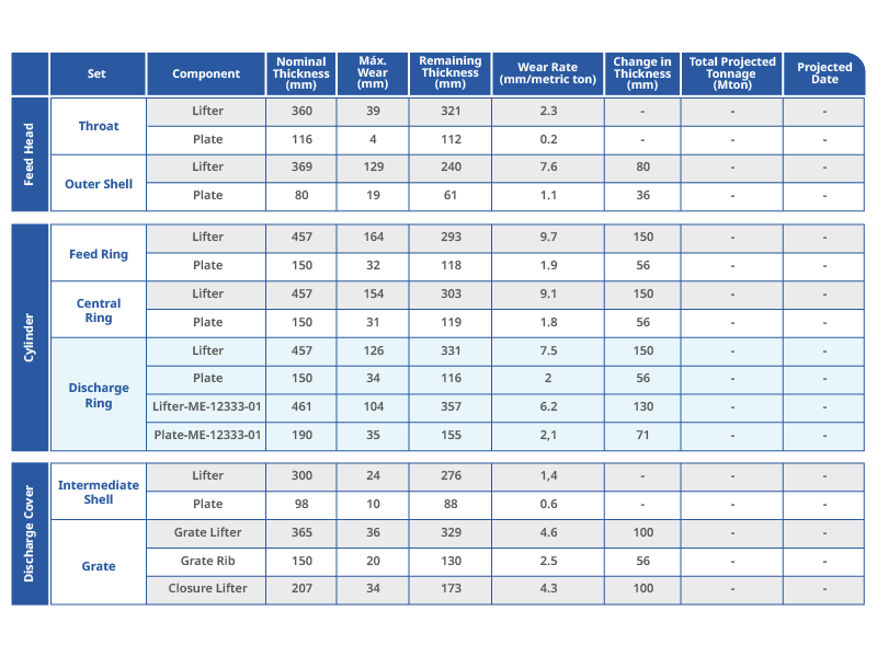 To address these challenges, the ME Elecmetal team replaced the SMX design with the ME PolyLight solution. This design features a plate with rolled steel inserts and a cast lifter section, specifically engineered to absorb operational deviations in the SAG mill and withstand high-impact conditions.