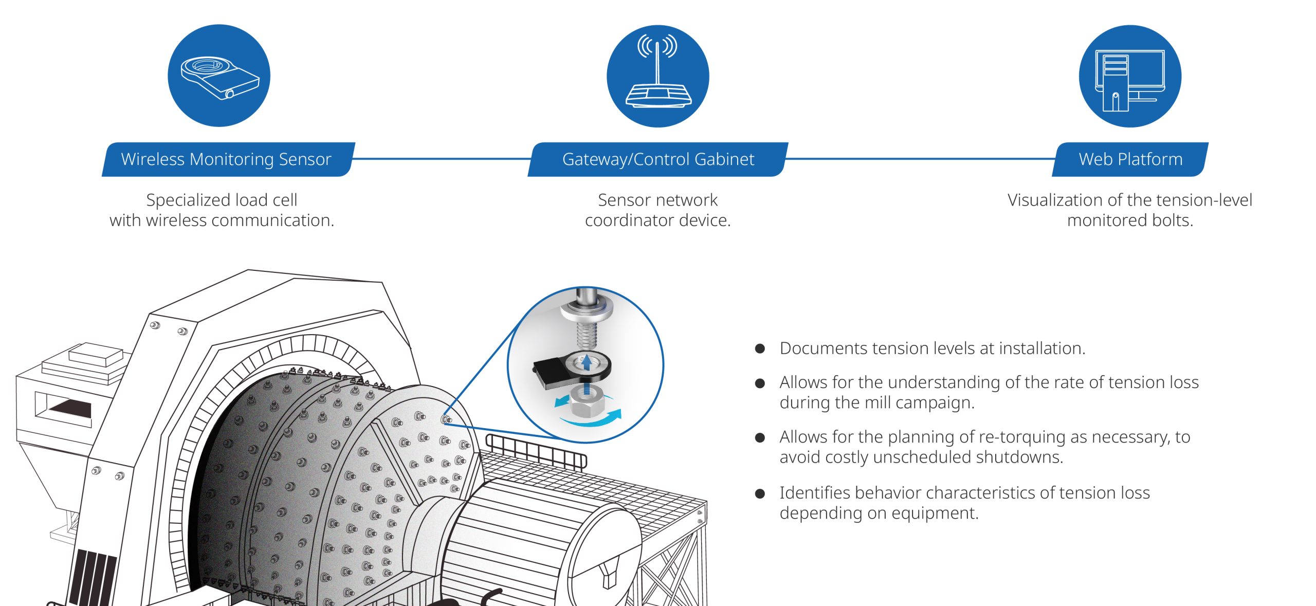For monitoring bolt tension, the installation of 73 sensors was proposed, with 38 allocated to SAG Mill 1 and 35 to SAG Mill 2.